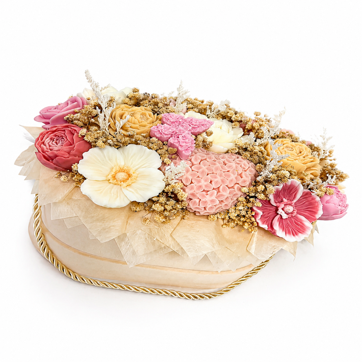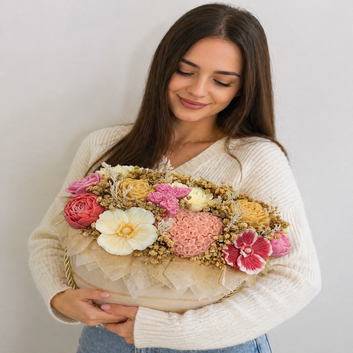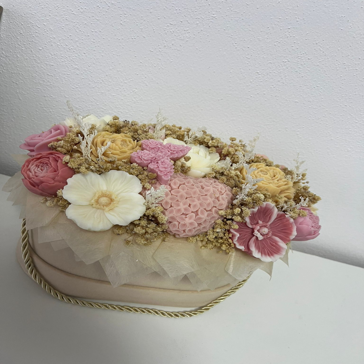 Transformă orice moment într-o amintire specială cu acest aranjament floral elegant, realizat din flori fine din săpun, atent lucrate pentru a reda frumusețea naturală a florilor reale. Fiecare detaliu este ales cu grijă, de la nuanțele delicate până la cutia decorativă rafinată, pentru a oferi un produs premium, perfect pentru cadouri deosebite.