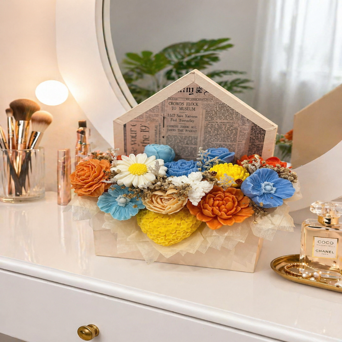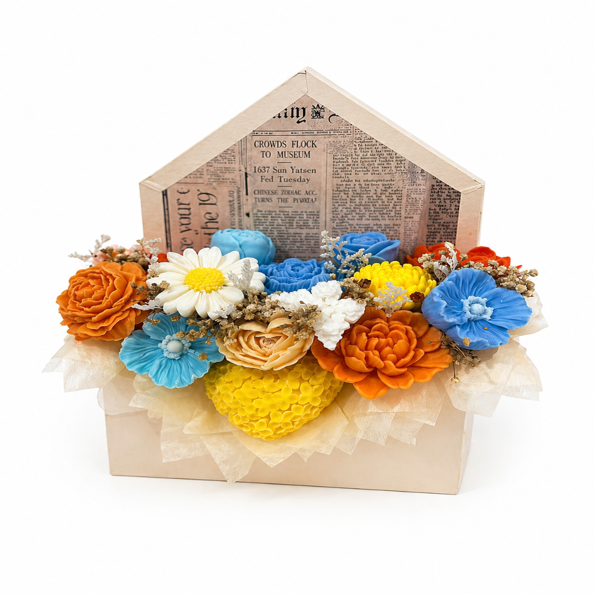 Aranjament Plin de Viață este un aranjament floral deosebit, realizat din flori din săpun atent modelate, care îmbină armonios nuanțe vibrante de galben, albastru, portocaliu și crem. Fiecare floare este lucrată cu grijă pentru a reda frumusețea naturală, oferind un aspect elegant și plin de viață, perfect pentru a înfrumuseța orice spațiu.