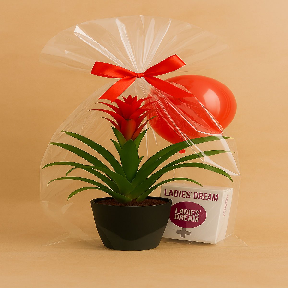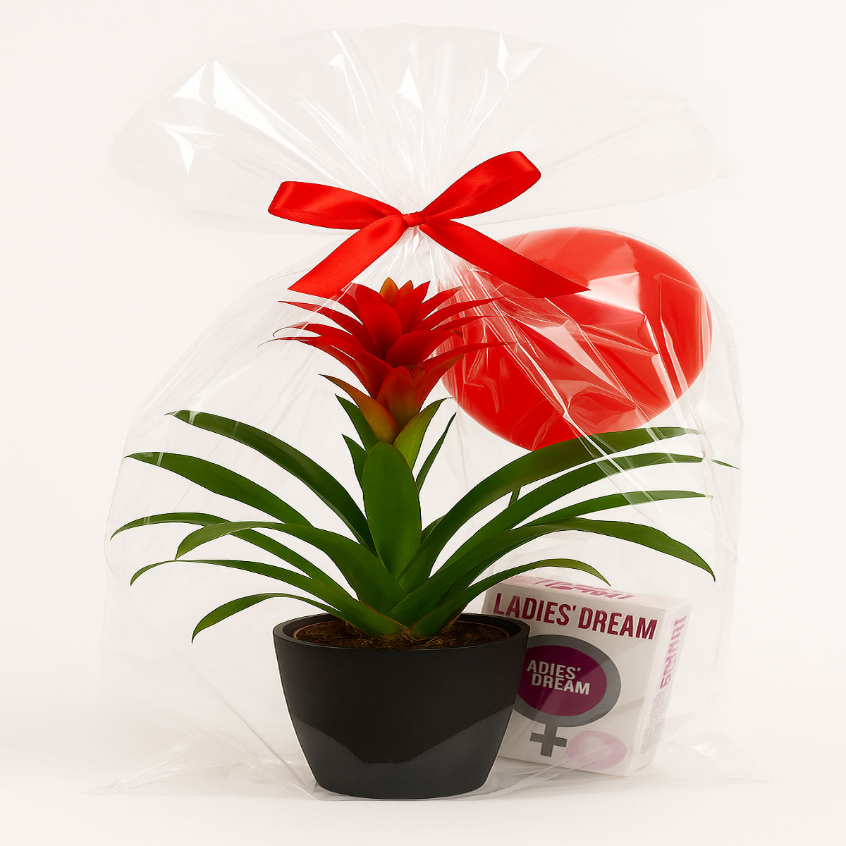 Conține: plantă decorativă naturală în ghiveci elegant, balon roșu, ambalaj premium cu fundiță satinată, doua produse pentru ea .