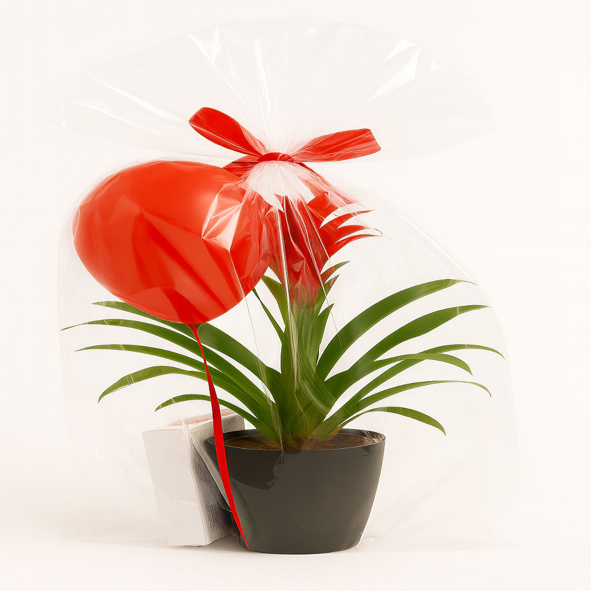 Planta decorativă, cu frunze verzi lucioase și floare roșie intensă, aduce un strop de viață și culoare în orice colț al casei. Este ambalată cu grijă într-un înveliș transparent, legat cu o fundiță roșie vibrantă, și însoțită de un balon care adaugă o notă jucăușă și romantică.