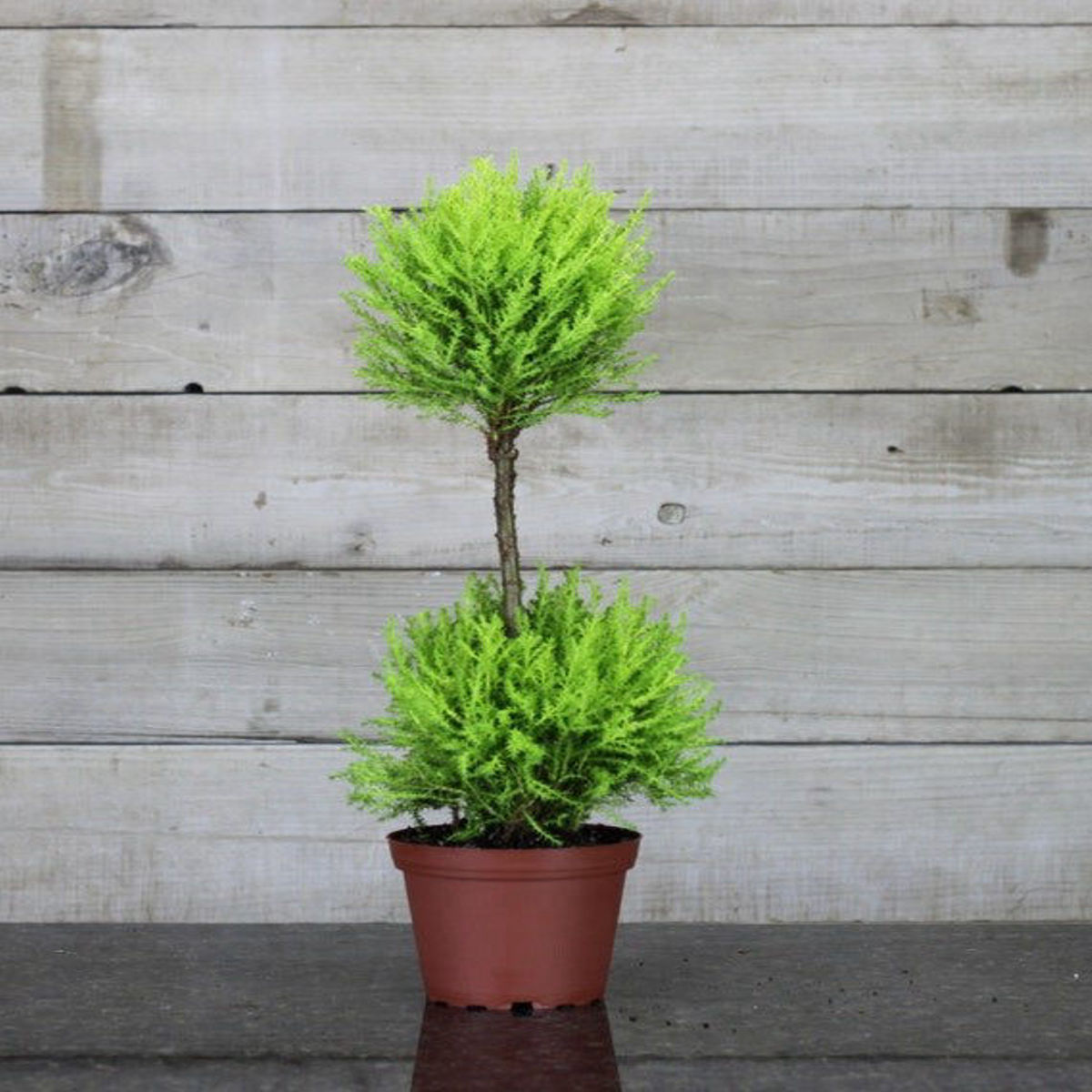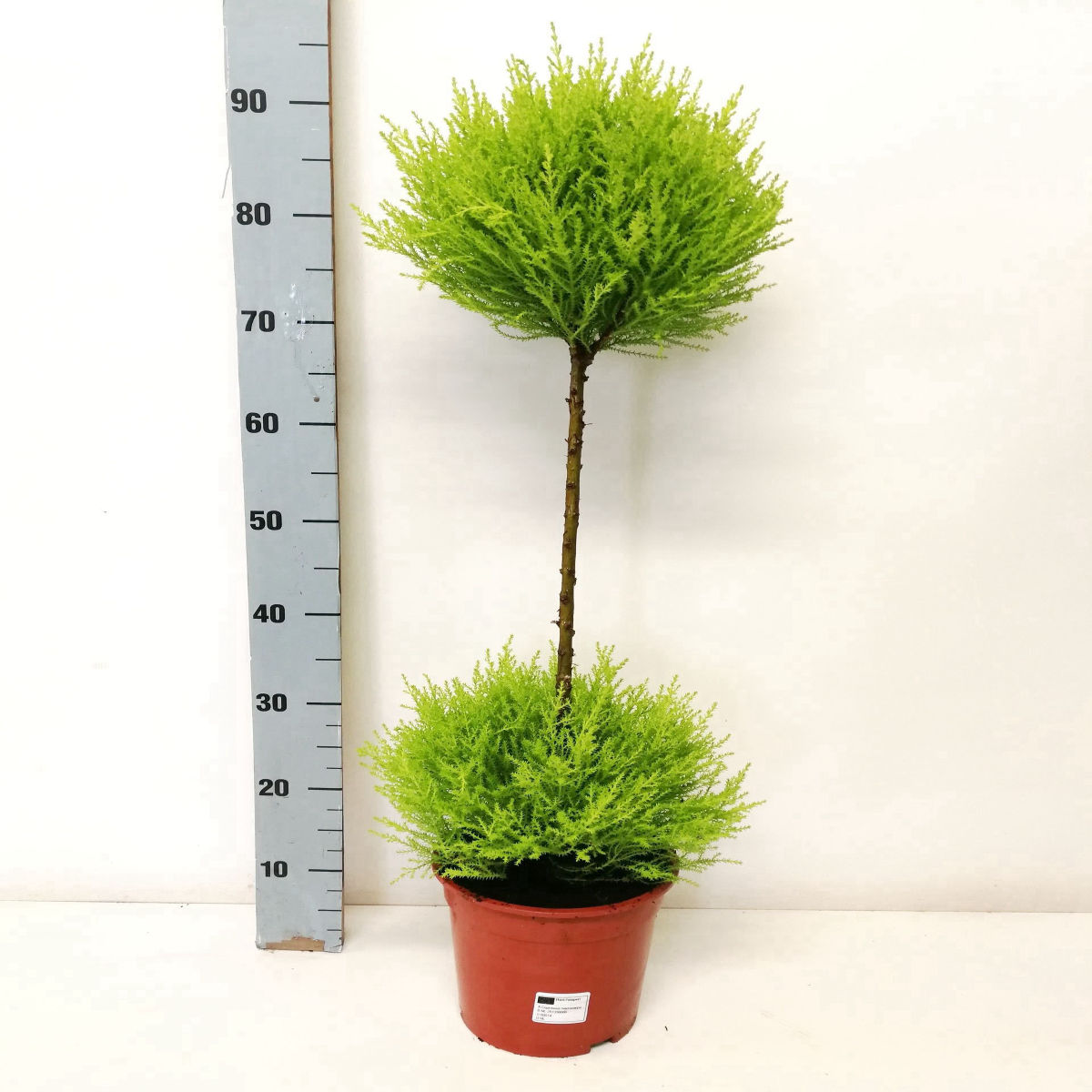 Cupressus macrocarpa ‘Goldcrest Wilma’ este o varietate ornamentală de chiparos de Monterey, foarte apreciată pentru culoarea sa intensă verde-gălbuie și pentru parfumul plăcut de lămâie. Planta are o formă conică naturală, compactă și simetrică, care îi conferă un aspect elegant și decorativ pe tot parcursul anului. Este potrivită atât pentru exterior, cât și pentru interior, aducând un accent viu și rafinat în orice spațiu.