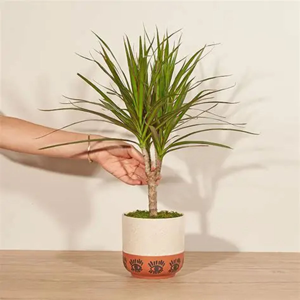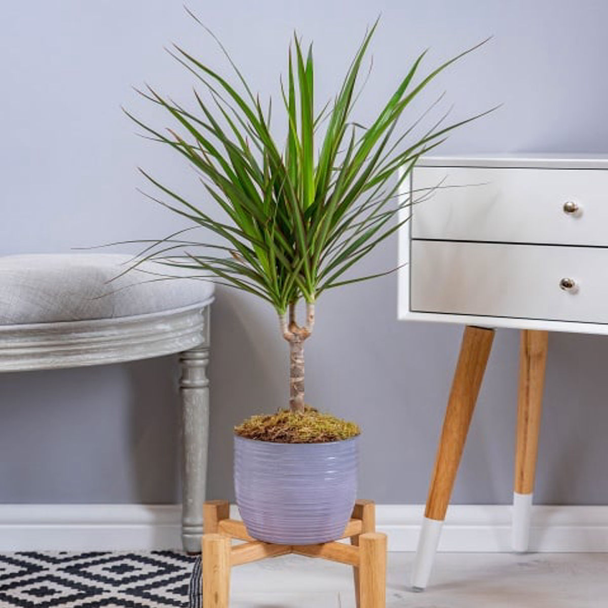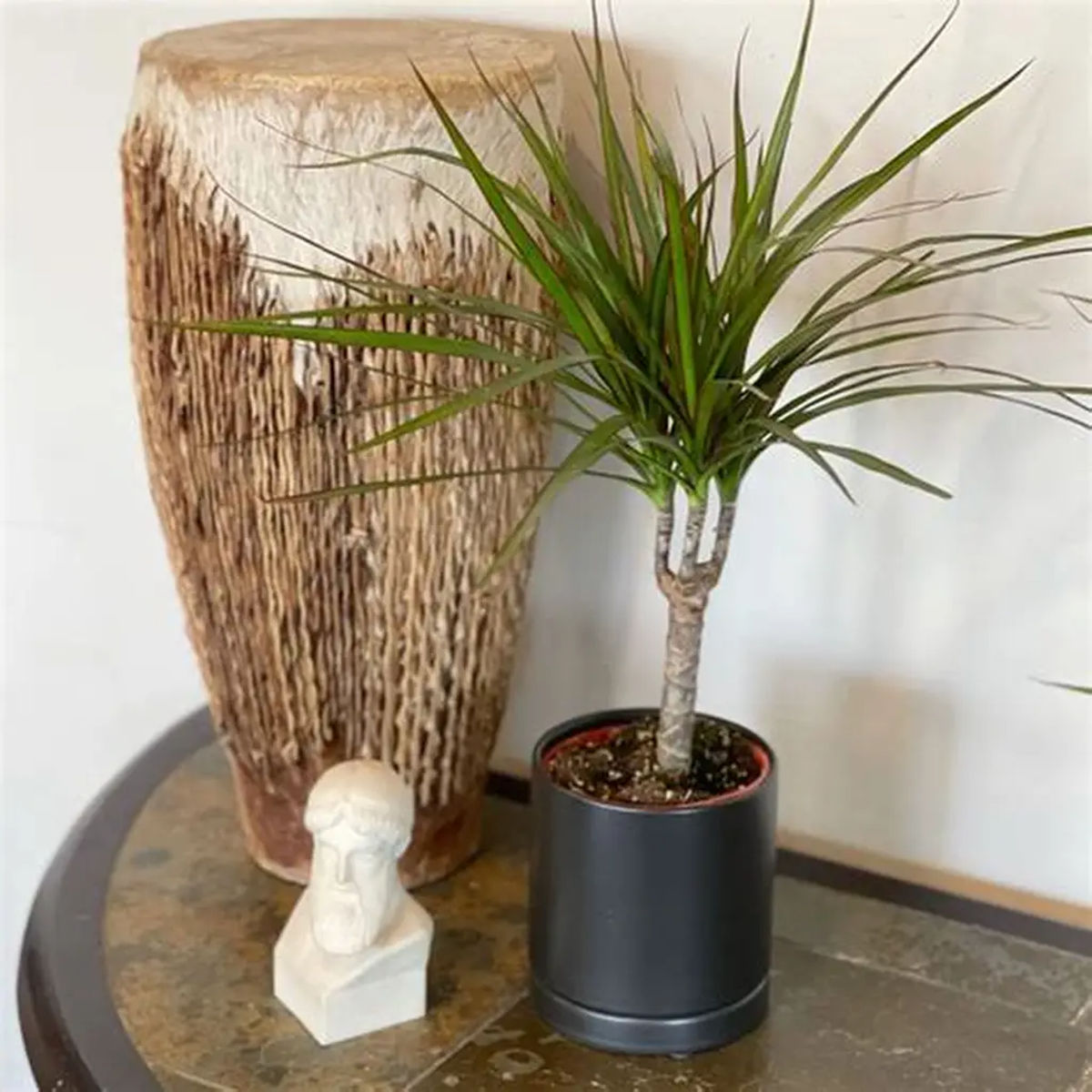 Dracaena marginata se remarcă prin tulpina sa subțire, verticală și frunzele înguste, arcuite, cu margini roșu-închis ce creează un contrast rafinat. Structura ei aerisită și verticală o face perfectă pentru decoruri moderne, minimaliste sau chiar industriale. Este o alegere excelentă pentru spații mici, rafturi, birouri sau colțuri care au nevoie de un accent verde, dar nu aglomerat.
