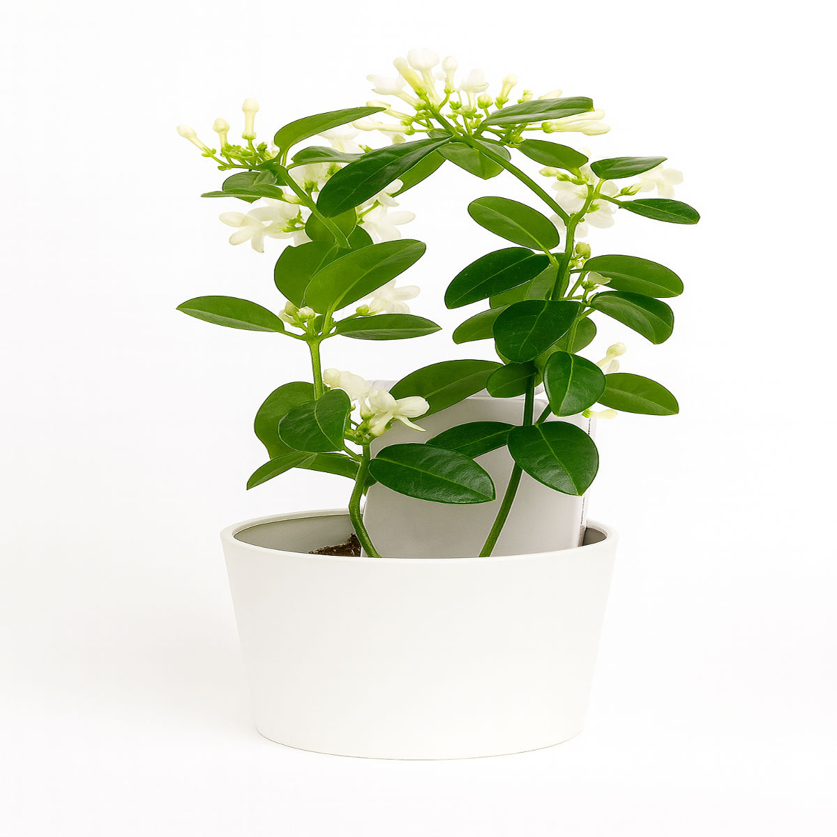 Iasomie înflorită este parfumul discret care aduce liniște și armonie, simbolizând dragostea pură și legătura sufletească. În ghiveciul elegant, albul imaculat al florilor se împletește cu verdele intens al frunzelor, creând imaginea perfectă a iubirii sincere și a pasiunii care nu se stinge niciodată.