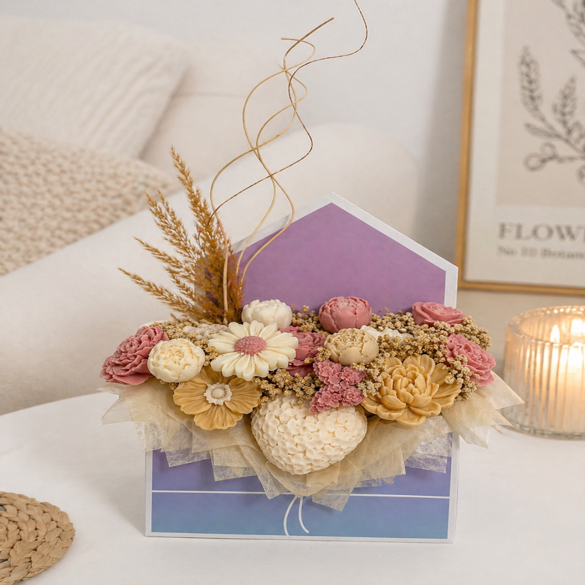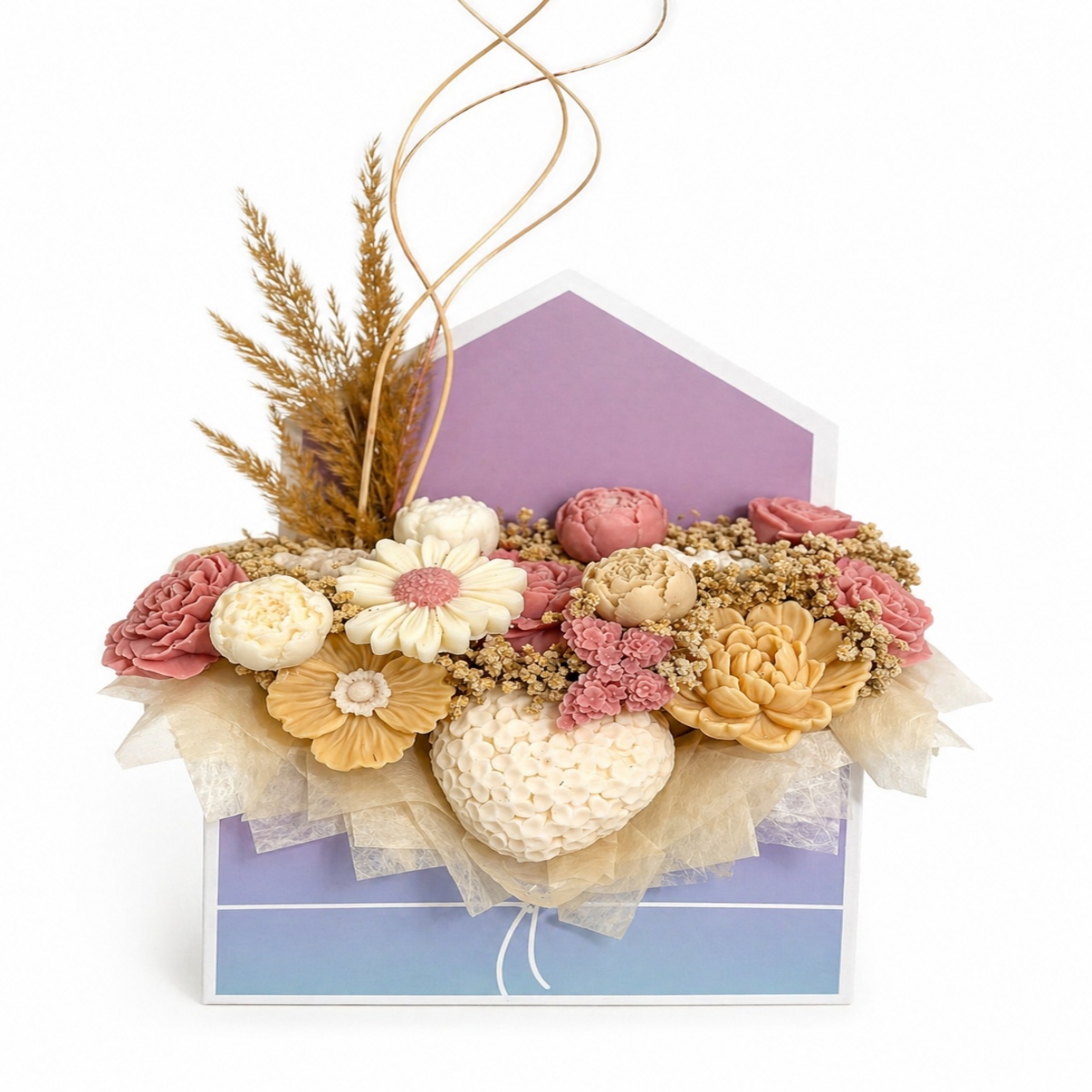 O Poveste Florală în Nuanțe Pastelate este un aranjament delicat și rafinat, creat pentru a aduce un plus de eleganță oricărui spațiu sau moment special. Realizat din flori din săpun atent lucrate, acest buchet impresionează prin detalii fine și culori armonioase – tonuri calde de crem, roz pal, piersică și accente subtile care creează o compoziție plină de farmec.