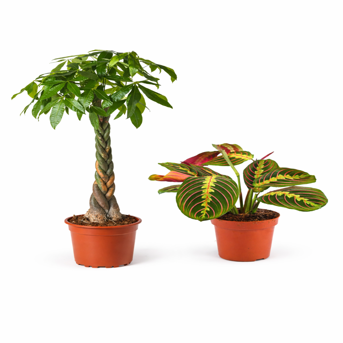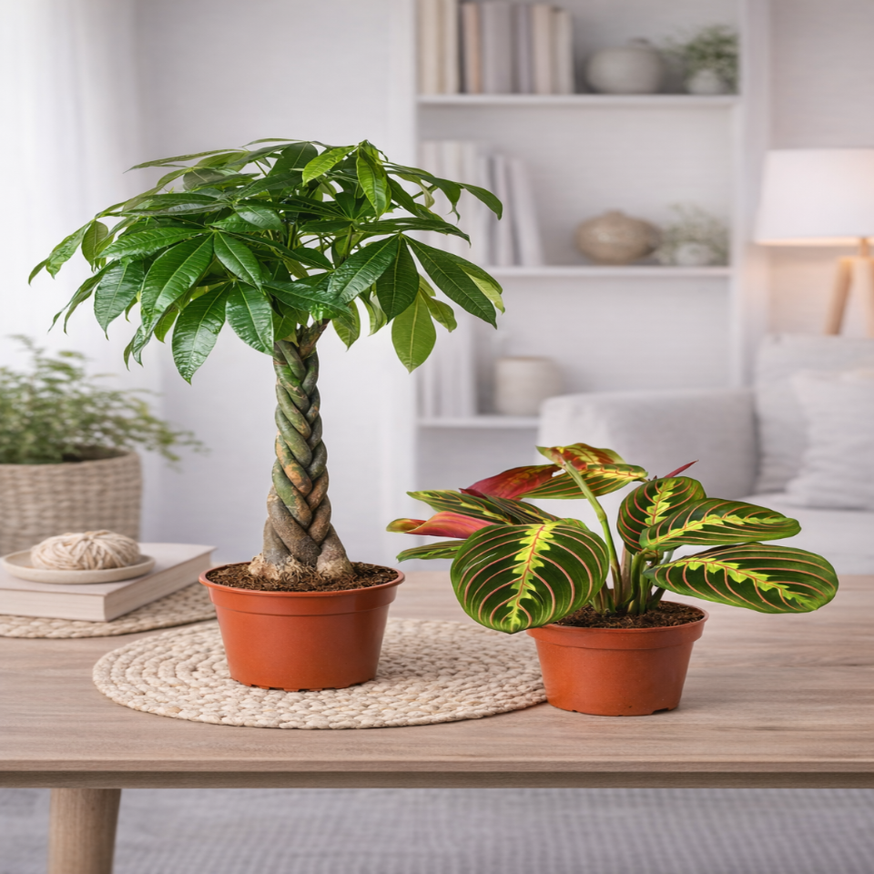 Pachet ideal pentru a aduce eleganță și energie pozitivă în locuință sau birou: Arborele Banilor (Pachira aquatica) înalt 40–50 cm și Maranta leuconeura înaltă aproximativ 40 cm. Ambele plante sunt livrate sănătoase, cultivate cu grijă, potrivite pentru decor interior și pentru cadouri.