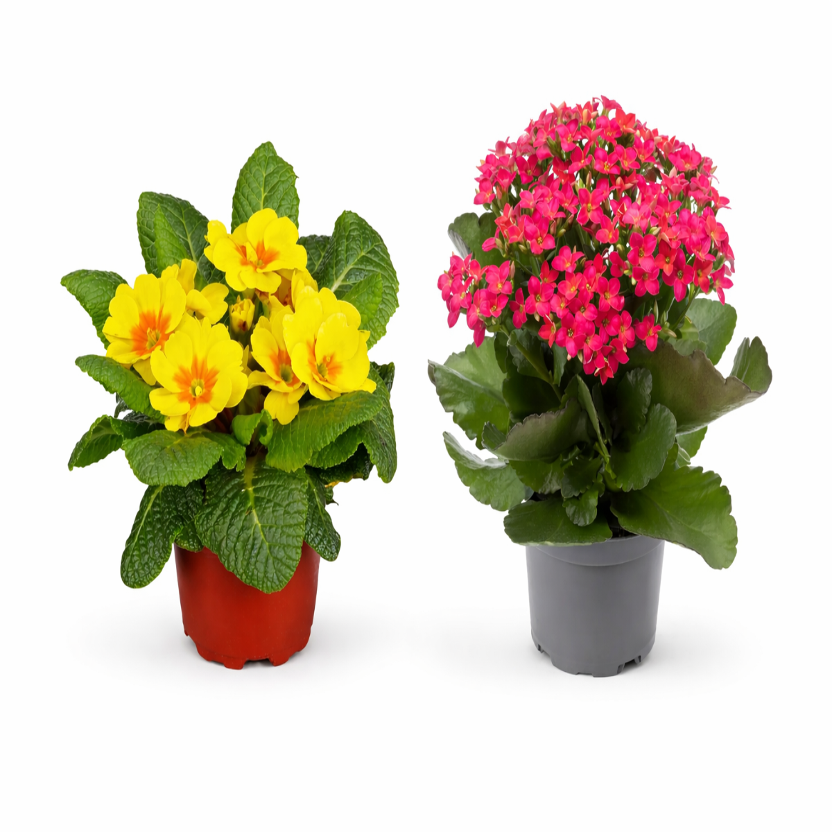 Pachet special: Kalanchoe mix (înălțime 15 cm) și Gloxinia naturală (înălțime 20 cm). Acest set combină două plante de interior ușor de întreținut, ideale pentru a înfrumuseța orice colț al locuinței sau biroului.
