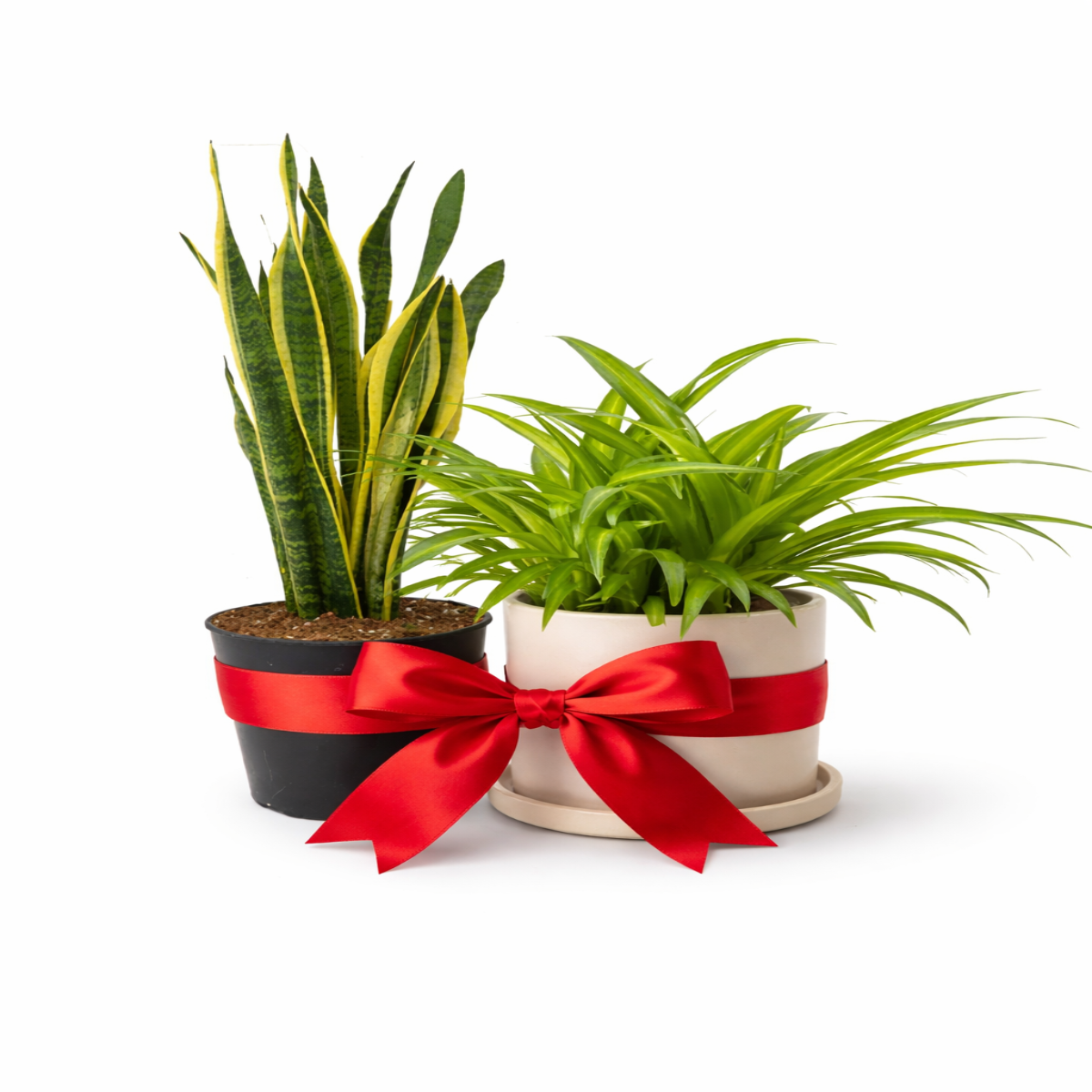 Pachet format din două plante de interior decorative: Sansevieria (înălțime aproximativă 40 cm) și Planta Păianjen (Chlorophytum) cu înălțime între 25 și 40 cm. Ambele specii sunt apreciate pentru întreținerea redusă și capacitatea de a purifica aerul, fiind ideale pentru locuințe, birouri sau spații comerciale. Sansevieria are frunze rigide, verticale, rezistente la variații de lumină și necesită udare rară, în timp ce Planta Păianjen se remarcă prin frunziș bogat și capacitatea de a produce pâlcuri noi (plante tinere) ce pot fi replantate.