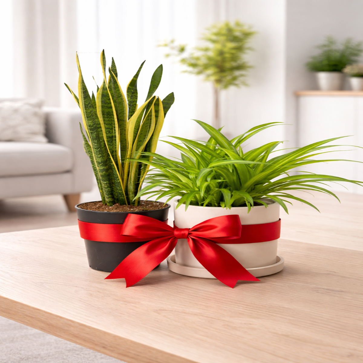 Pachet format din două plante de interior ideale pentru decor și îmbunătățirea calității aerului: o Sansevieria (40 cm) și o Planta Păianjen (25–40 cm). Ambele vin gata pentru amplasare în casă sau birou, potrivite atât pentru începători, cât și pentru pasionați de plante.