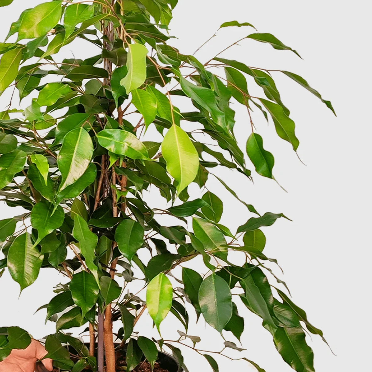 Originar din regiunile tropicale ale Asiei și Australiei, Ficus benjamina se remarcă prin frunzele sale mici, ovale, de un verde intens și lucios, care formează o coroană densă și armonioasă. Tulpina sa subțire, elegantă, poate fi uneori împletită sau formată decorativ, ceea ce conferă plantei un aspect sofisticat, ideal pentru interioare moderne, birouri sau spații comerciale.