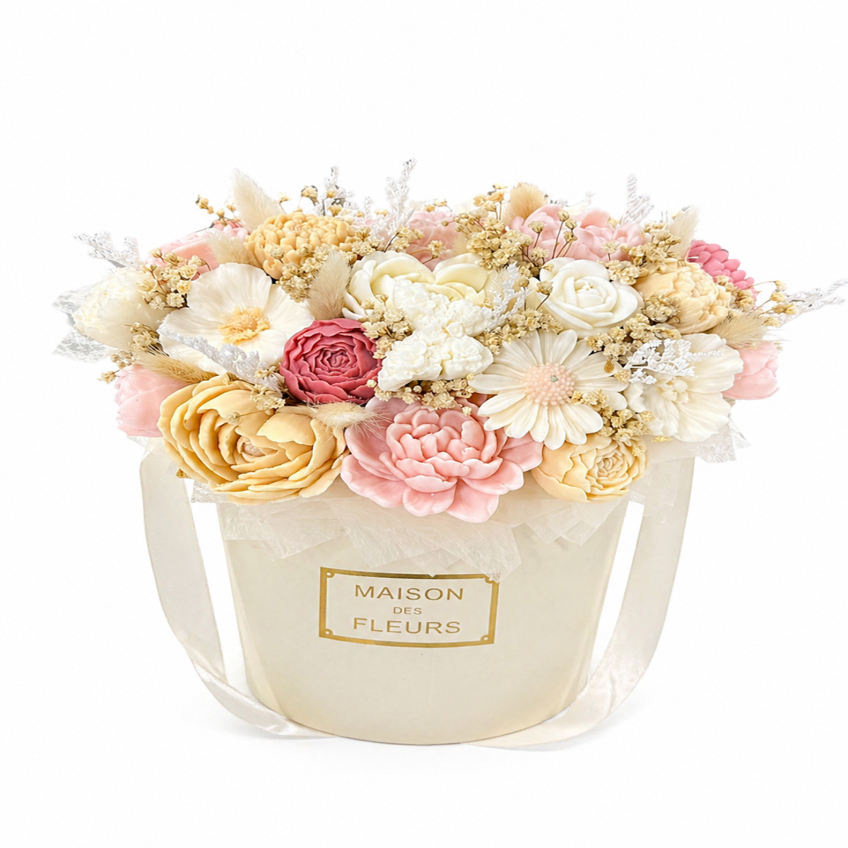 Poveste Florală în Cutie Premium este un aranjament elegant și rafinat, realizat cu grijă din flori din ceară, creat pentru a impresiona prin frumusețe și durabilitate. Fiecare floare este atent modelată pentru a reda detalii realiste, în nuanțe pastelate armonioase, ce transmit delicatețe, stil și emoție.
