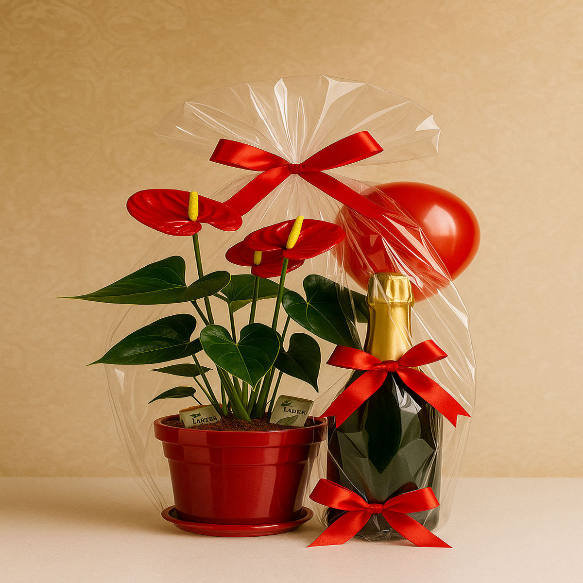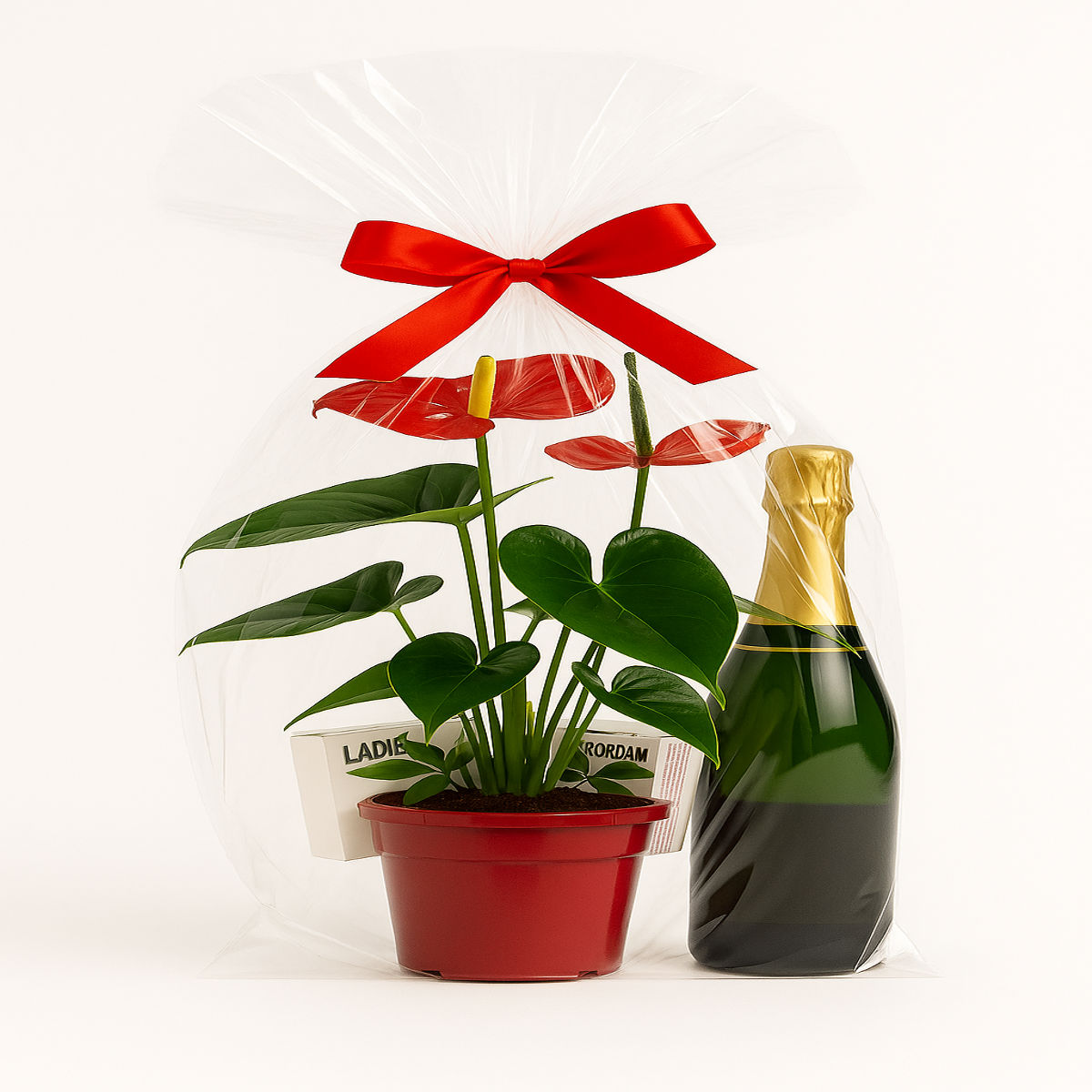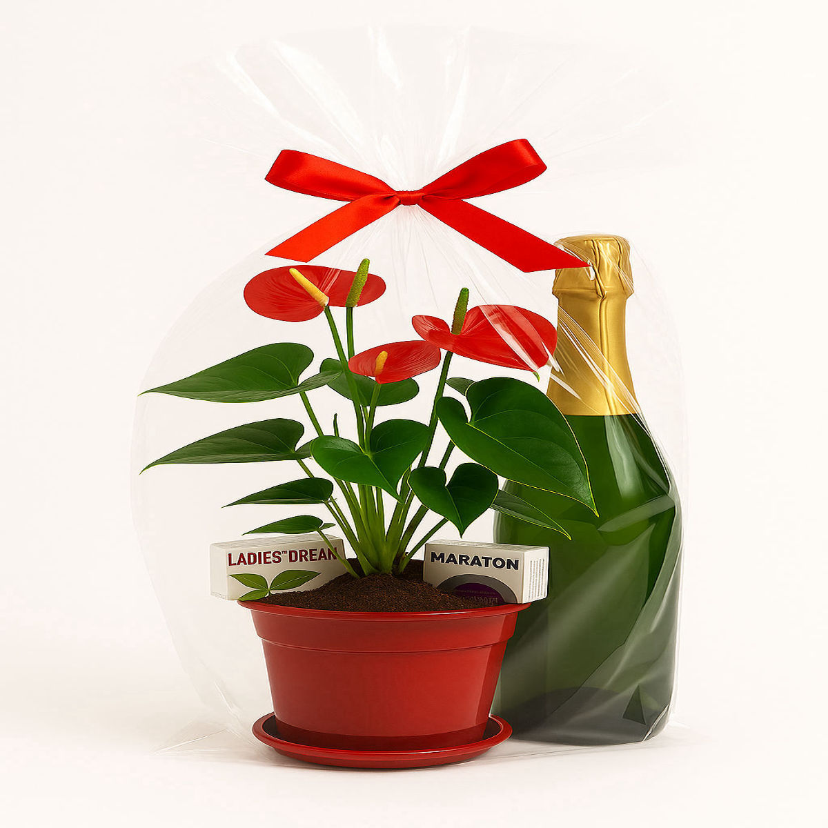 Conține: plantă decorativă anthurium în ghiveci elegant, sticlă de șampanie, ambalaj premium cu fundiță satinată, doua produse pentru ea, patru produse pentru el .